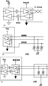 3. 采用隔离接口。有些情况下,出于安全或其他方面的考虑,电路地必须与机壳或大地相连,不能悬浮,这时可以采用隔离接口来隔断接地回路,但是仍然应该有一条地线将隔离侧的公共端与其它接口的工作地相连(图4d)。