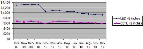 2009年10月~2010年10月北美42寸LED和CCFL背光电视的平均售价