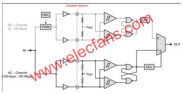 图1显示了一款数字电容隔离器(DCI)的内部结构图。该隔离器输入分为两个差分信号路径:一条为高数据速率通道(称作AC-通道),另一条为低数据速率通道(称作DC-通道)。AC-通道传输介于100kbps和100Mbps之间的信号,而DC-通道则涵盖了从100kbps到DC的范围。