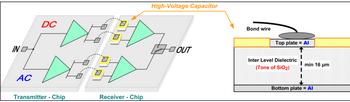 图2的右侧显示了一个高压电容器的横截面。从发送器芯片出来的接合线连接到接收机端电容器铝顶板。底板(也为铝质)连接到接收机逻辑。板之间是夹层电介质,其为16-μm厚的二氧化硅(SiO2)层。