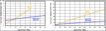 图3电容和电感隔离器的电流消耗(左图为双通道隔离器,右图为四通道隔离器)