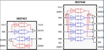 四通道隔离器用于隔离包括数据和控制线路的接口(例如:SPI),其数据速率一般可达20到80Mbps。电感和电容隔离器之间的电流消耗在30Mbps下时已经有10mA以上的差别,在如100Mbps等更高数据速率下时这一差别可高达40mA。