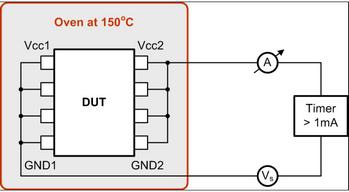 实际上,周围温度维持在150oC时,TDDB由隔离器的施加应力电压决定(请参见图5)。测试之初便激活一个计时器,其在隔离器电流超出1mA时停止,表明电介质击穿。记录每个测试电压的故障时间,并根据理论E模型曲线进行绘图。
