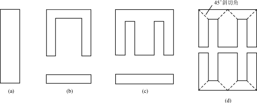 叠片式铁心是把硅钢带材通过剪切或冲压成铁心片,然后叠装成一定结构形式的铁心。从铁心片形状发展来看(图1),最早是单I形,后来是CI形、EI形和EE形,其目的是便于叠装,减少工时。如果材料是取向硅钢带,要注意使磁路中磁力线方向与硅钢取向一致,不要与硅钢取向垂直,否则会增加铁心激磁能量和铁心损耗。为了解决转角处磁力线方向不与硅钢取向垂直,后来又发展成45°斜切角形片形。