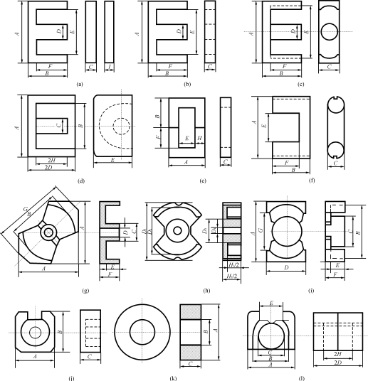 软磁铁氧体的铁心结构比较多,这是由于采用热压工艺,比较容易加工成各种形状。有EI、EE、EER、EP、UF、UYF、RM、PM、PQ、Q(罐形)、T(环形)和LP形等等(图8)。EI形以尺寸A(E形铁心宽度)为标志,EE形以尺寸A(E形铁心宽度)和2×B(E形铁心长度)为标志,已形成EI10~50,EE8.3/8.0~110/80系列,品种多,制造工艺简单成熟,散热好,便于引出接线,成本较低。缺点是铁心中间柱截面为方形,给线圈绕制带来麻烦。同时,无屏蔽,容易产生杂散磁场干扰。EER形也是以尺寸A(E形铁心宽度)和2×B(E形铁心长度)为标志,已形成EER25/33~54/50系列,铁心中间柱截面为圆形,绕线比较方便,同时绕线长度比方形截面缩短11%,从而降低铜损。