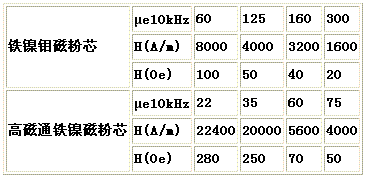 除了表1所列性能而外,一般还给出有效磁导率μe与频率f的关系曲线。与软磁铁氧体类似,在超过一定极限工作频率以后,有效磁导率会迅速下降。同时,还给出在有效磁导率μe下降50%的外加磁场强度,也就是恒磁范围。表2是铁镍钼磁粉芯和高磁通铁镍磁粉芯的恒磁范围。还有,对用于输出滤波器的磁粉芯,必须给出交直流同时磁化曲线,表示在大的直流磁化条件下,磁粉芯有效磁导率的变化情况。