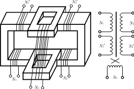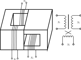 从20世纪80年代末开始,对由垂直形铁心构成的立体布置的多功能铁心结构进行研究的人员越来越多。最早是有人把C形铁心的一半转90°而形成的,发现在没转90°的C形铁心上的绕组之间仍存在变压器功能,转90°的C形铁心上绕上一个绕组,可以通过电流激磁后,改变没转90°的C形铁心上绕组的电感〔见图11(a)〕。后来把铁心去掉一些变成图11(b),仍然具有这样的功能。图11(c)是把两个变压器和两个可控电感组合在一起的多功能铁心结构。