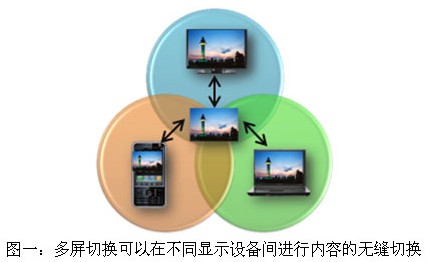 目前我国的三网融合进程正在加速。三网融合带给用户最大的体验就是多屏幕的融合,同样的服务可以由不同的终端设备实现,而不同的设备也可以访问相同的资源。在三网融合的大背景下,多屏切换的概念也应运而生。多屏切换在多屏幕融合基础上,向用户提供了多个显示终端的跨屏交互服务,用户的使用内容可以在不同显示终端的屏幕上进行无缝连接。举例来说,对于同样的一段视频,用户在户外可以用手机观看一部分,在办公场所可以用PC接续观看,而回到家中则可以继续用电视观看剩余的部分。对于其他的应用,如游戏、音乐等,多屏切换也允许进行类似的操作。从数字电视的角度来看,多屏切换对数字电视有极大的推动作用。数字电视做为最传统也是显示面积最具优势的设备,可以提供不同于手机和PC的体验。