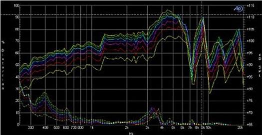 图1:扬声器+音箱频率响应以及信号电平失真。