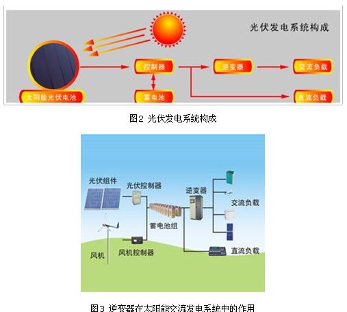 太阳能交流发电系统是由光伏组件、光伏控制器、蓄电池组和逆变器共同组成(如图1),,其中,逆变器是最重要的部分。逆变器是一种电源转换装置,其主要功能是将蓄电池的直流电逆变成交流电,图2表示了逆变器在太阳能交流发电系统中的作用。