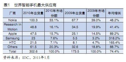 2010年智能手机获宠热销,世界顶级手机厂商经营冷热互见,手机业老大诺基亚,以及名列三、四的LG和Sony-Ericsson都因未及时赶上智能手机浪潮而致市占率滑落,RIM、苹果与宏达(HTC)等公司看准苗头,强势出击,倾力经营智能手机而扩大了市占率,名列前八的Motorola则又因传统手机跌幅太大而致市占率萎缩(见表1)。