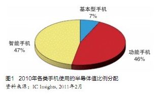 平均算来,现今一部手机使用的半导体价值约30美元,世界全部手机使用的半导体总值约占半导体市场近20%,是仅次于PC和消费电子的第三大应用产品,足见其影响力。智能手机的半导体含量更大,它装备更加优良的处理器,更多的DRAM和NAND。据称,它与基本手机半导体含量之比约为9:1,其对半导体业的重要性更可见一斑。市场调研公司IC Isights报告指出,2010年世界手机使用半导体产品共425亿美元,其中智能手机(Smartphone)200亿美元,占47%,首次超过增强型手机(Enhanced),基本型手机(Basic)用半导体仅30亿美元,占7%(见图1)。预计2014年手机使用半导体将增至555亿美元,年均增长率7.5%,智能手机使用半导体则将以每年20%的速度迅猛成长,届时将达416亿美元,独占手机用半导体的75%,相反基本型手机届时将进一步缩减至仅为16亿美元,只及2010年的一半。