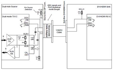对于DDC信号,双模源端设备必须隔离AUXCH信号线上的耦合电容和DDC信号线。图4给出了信号隔离的方法。