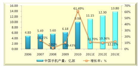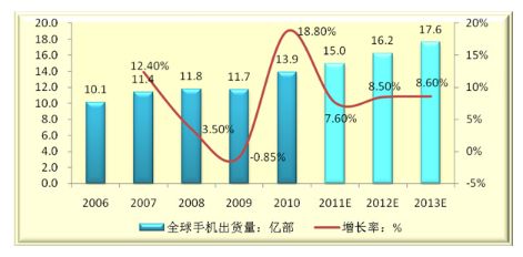 - 预计2010-2013年全球手机出货量将保持7%以上的增速