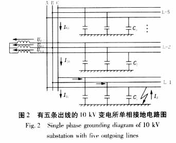 这样,当系统的某一条出线i(i=1,2,...,n)发生单相接地故障时,利用系统零序电压与故障线路零序电流可求出该系统除了故障线路以外的其它线路对地电容值之和