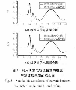 对上述方法用Matlab编程,对仿真数据进行分析,求解系统对地电容值??悸堑皆肷廴疽约案髦炙婊扇诺拇嬖冢榷怨收鲜萁惺致瞬?,将17次以上的谐波去除后再对仿真或实测数据进行运算。本例所得由电容所计算电流与滤波后电流拟合波形如图3所示(本文对数据滤波时采用的是巴特沃思滤波器,除去9次谐波以上的高次谐波)。