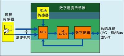 温度数据变为可用所需的时间称为转换速率。该速率由器件内部振荡器和A/D分辨率决定,一般低于100Hz或长于10ms。转换速率越快,温度数据可检索的速度就越快,同时温度传感器消耗的功率也就越大。由于存在自加热效应,转换速率通常较低。图1显示了一个远程温度传感器和/或本地温度传感器的简化框图。