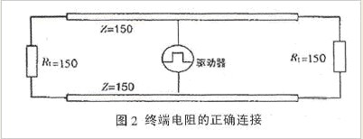②阻抗不连续,顾名思义,与光从一种媒质进入另一种媒质时所引起的反射是相似的。信号在传输线末端突然遇到电缆阻抗很小甚至没有,信号在这个地方就会引起反射。消除这种反射最常用的方法,是在电缆的末端跨接一个与电缆的特性阻抗同样大小的终端电阻,使电缆的阻抗连续。由于信号在电缆上的传输是双向的,因此,在通讯电缆的另一端同样要跨接一个相同大小的终端电阻,如图2所示。
