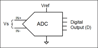 用于将传感器信号数字化的ADC也是比例器件。无论其内部架构如何,所有ADC都是通过对未知输入电压与已知参考电压相比较来工作的。转换器的数字化输出是输入电压与参考电压的比值乘以ADC的满量程读数。考虑到内部放大和设计的多样性,还需要一个比例因子K。无论K值大小,只要ADC的配置未改变,K值都保持固定不变。公式4描述了一个普遍意义上的ADC (图2)的数字读数(D)和输入信号(Vs),参考电压(Vref),满量程读数(FS)以及比例因子(K)间的关系。