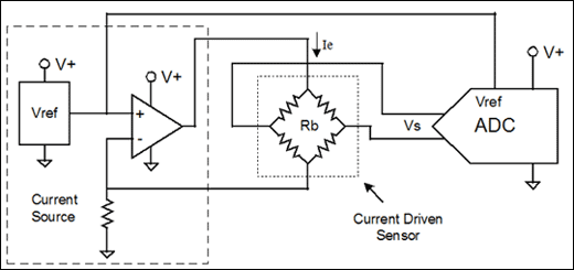 图4. 该设计中电流驱动传感器的电流源由一个电阻,一个运算放大器和一个电压基准组成。