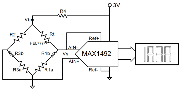 根据公式19,R4的值不会影响读数。电路中增加R4可以降低RTD的自身热量。同时也减弱了来自电桥的信号,并且降低了参考电压。虽然MAX1492无内部PGA,但是它允许使用较小的参考电压。使用较小的参考电压可以省去额外的放大电路。