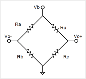 图9是一个由同一电压源供电的两个分压器组成的惠斯通电桥。习惯将电桥画成菱形,因为这种形状强调了同一电压源为每个分压器供电的重要性。电桥的输出(Vo)是两个分压器输出电压之差(公式15)。当Vo为零时,称电桥达到平衡。在这种条件下,因为Ve与一个为零项相乘,所以激励电压(Ve)的精确值并不重要。公式16可计算出平衡电桥中未知电阻(Ru)的阻值。在实际应用中,通常使Ra = Rb,这样公式16可简化为Ru = Rc。