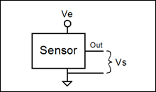 使用阻性元件的传感器通常令一个电流流过电阻并测量其电压。在输出传感器之前,可以将该电压进行放大或电平偏移,但是其大小仍然与流过电阻的电流相关。如果该电流来自于电源电压,那么传感器的输出与电源电压成比例。公式2描述了这类比例传感器的输出(图1),其中Vs是输出信号,Ve是激励电压,S是传感器的灵敏度,P是所测参数的量值,C是传感器的失调量。