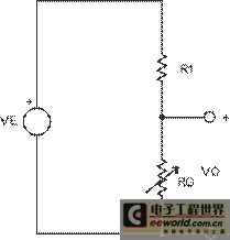 图 1 显示的是您如何使用一个分压器测量电阻。VE 表示激发电压。RG 值为: