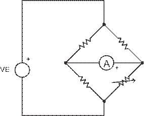 图 4 所示的惠斯通桥接是一款我们所熟悉的电路,主要用于高精度地测量电阻。1833 年, Hunter Christie 发明了这种电路,随后 Charles Wheatstone 对其进行了研究,并做了广泛的分析,Wheatstone 桥接便因此得名。Wheatstone 还首次运用独特的钻石形风格绘制这种电路,并一直沿用至今。