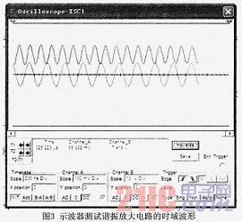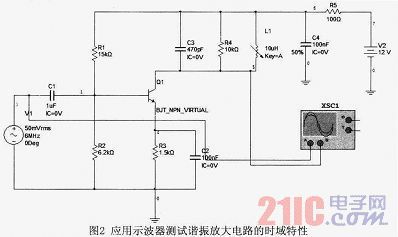 在小信号谐振放大中,电路的输入信号中除了所需要的信号外还有不需要的信号,它们的频谱往往不同,所以用选频的方法,选取需要的频率分量,抑制不需要的频率分量。另外,其中有用信号的幅度往往也很小,处理这种信号必须具有选频和放大双重功能。小信号谐振放大器电路中晶体管集电极负载是LC并联谐振电路,其阻抗是随频率而变化的,回路谐振频率f0上的阻抗为纯电阻并且是最大的,因此谐振放大器在负载回路的谐振频率上具有最大的电压放大增益,稍离开此谐振中心频率,电压增益就会迅速减小。在分析中采用仿真软件来测试谐振放大电路的时域的输入输出波形。分析测试电路如图2所示。