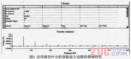 在频域分析中就是以频率作为分析的变量,分析信号中不同的频率分量构成。在频率分析中,较为重要的概念就是电路的通频带与选择性,作为谐振放大电路一方面要通过所需的频率成分,因而对其具有通频带的要求,另一方面,要抑制不需要的信号的频率成分,这种通过有效成分抑制无效成分的性质称为选择性。但在实际应用中往往要求通频带以内传输系数尽可能大,通频带以外传输系数尽可能小,这样信号失真小,抑制干扰能力强,由此可见通频带与选择性相矛盾,故用矩形系数K0.1说明。理想谐振放大器的频率特性曲线,其矩形系数K0.1应等于1,实际的谐振放大器的矩形系数总是大于1的。应用软件的傅里叶分析的频谱图如图4所示。