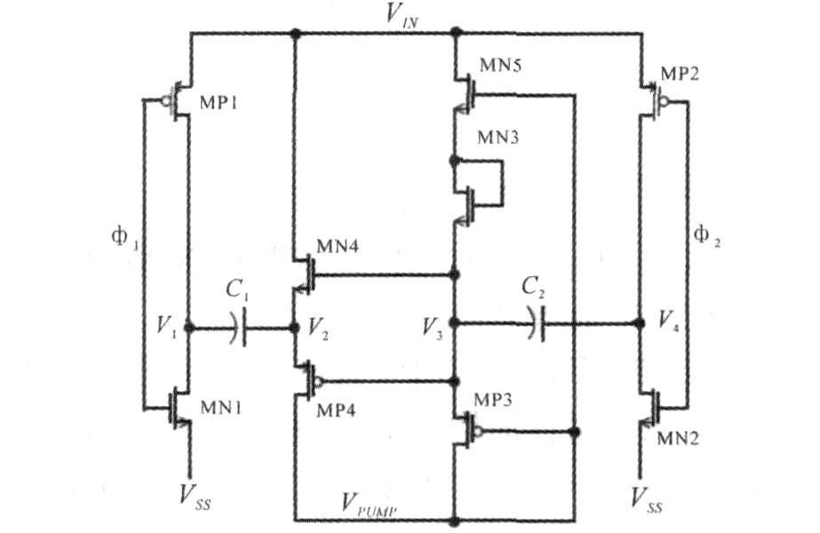 自举电荷泵不需要为MN2和MP2提供栅驱动电压,控制简单,但输出电压会有一个阈值损失。图3是改进后的电荷泵电路图,1和2为互补无交叠时钟。由MN2、MN5、MP3、MP2和电容C2组成的次电荷泵为MN4、MP4提供栅压,以保证其完全关断和开启。当1为低电平时,MP1导通,电位增加,此时,V3电位为零,MP4导通,V2上的电荷转移到栅电容CGATE上,VPUMP电位升高。当1为高电平时,MP2导通,为C2充电,V4电位上升至电源电位,V3电位随之上升,MP3导通,VPUMP电位继续升高。MN3相当于二极管,起单向导电的作用。