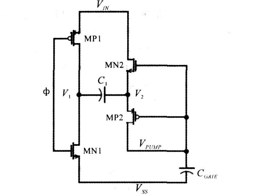 图2为一种自举型(SelfBoost)电荷泵的电路原理图。图中,为时钟信号,控制电荷泵工作。初始阶段电容,C1和功率管栅电容CGATE上的电荷均为零。当为低电平时,MP1导通,为C1充电,V1电位升至电源电位,V2电位增加,MP2管导通。假设栅电容远大于电容C1,V2上的电荷全部转移到栅电容CGATE上。当为高电平时,MN1导通,为C1左极板放电,V1电位下降至地电位,V2电位下降,MP2管截止,MN2管导通,给电容C1右极板充电至VIN。在的下个低电平时,V1电位升至电源电位,V2电位增加至2VIN,MP2管导通,VPUMP电位升至2VIN-VT。