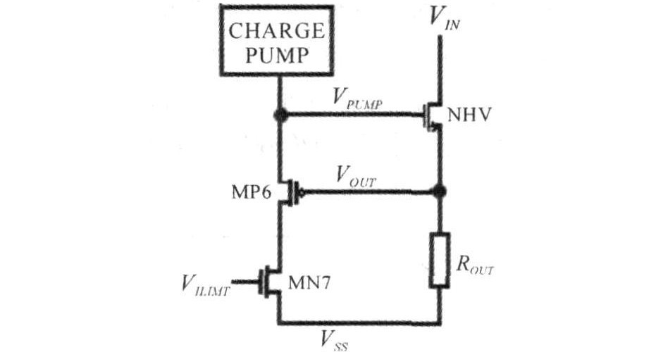 当出现过载和短路故障时,负载电流达到数安培,需要精确的限流电路为功率管和输入电源提供?;?。对于MOS器件,只有工作在饱和区时的电流容易控制。限流就是通过反馈负载电压,调节电荷泵输出电压来实现的。图4是限流电路的原理图。