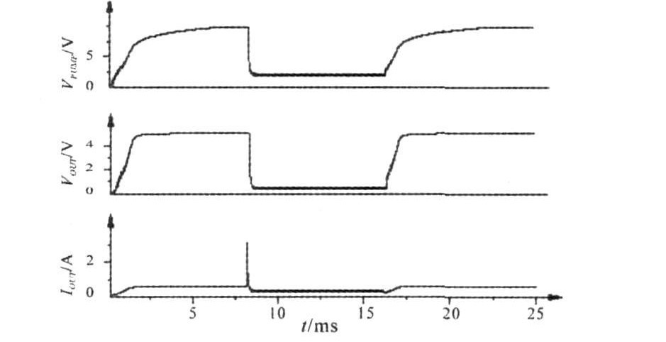 图6 USB开关在启动、限流和恢复正常过程中,电荷泵输出电压、负载输出电压和功率管电流的仿真波形