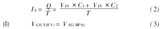 当负载电流超过1A时,电流限信号(VLIMIT)为高电平,MN7导通,栅电荷经MP6流向地,栅电压减小,功率管工作在饱和区。C1、C2为电荷泵电容值,在一个时钟周期T内,由电荷泵充入的栅电荷为: