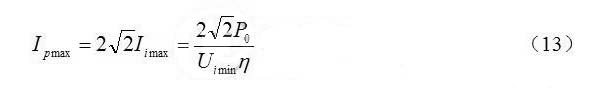 为避免音频噪声,在输入电压范围内,开关频率应在20kHz以上。从以上分析可知,在最高输入电压峰值时,开关频率最低。故假定在最高输入电压峰值的开关周期为50μs.由式(11)求得