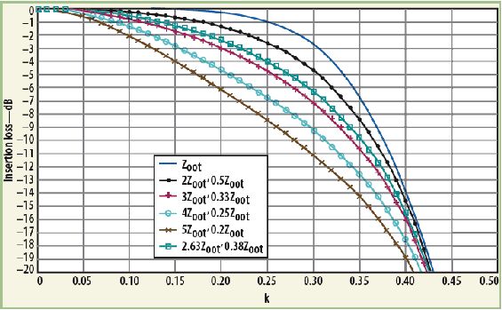 图4中,对于优化和非优化的特性阻抗值,都把插损看作k的函数。相比采用了优化特性阻抗的情况,特性阻抗非优化时,插损增加,带宽减小。于是,使用绞合传输线很容易获得最佳特性阻抗值。