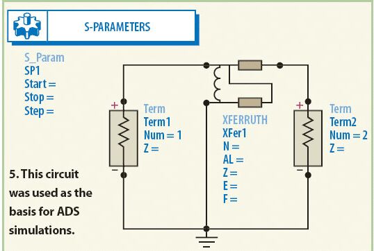 为了对变压器响应进行散射参数(S参数)仿真,ADS采用它的S_Param建模器,按照规定的步长和刻度步长调节初始(开始)的和最终(停止)的扫频频率。源和负载阻抗由一个阻抗值为Z的、被称为Term的特殊终端表示。图5所示为ADS仿真中所用的电路。