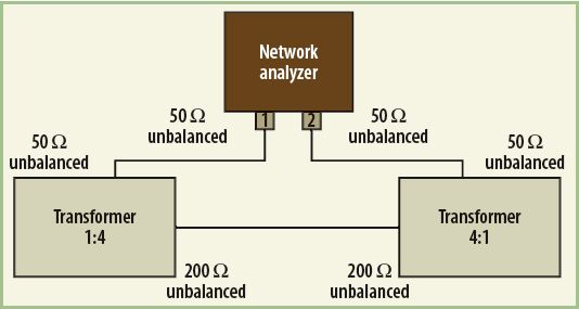 测量在Advantest的一个商用VNA,300kHz至3.8GHz模型R3765CG上进行。这个分析仪配有50Ω端接阻抗的非平衡测试端口。由于宽带unun阻抗变压器具有非平衡终端,转换比率为1:4,为了让该器件与测试设备相匹配,需要另一个转换比率为4:1的器件来执行阻抗转换。图6和图7显示了所有的终端连接。测试终端和所有用于VNA的线缆都经过校准,以最大限度地减少它们出现错误的可能性。插损和通带响应利用表示为对数幅值形式的传输系数S21来分析。