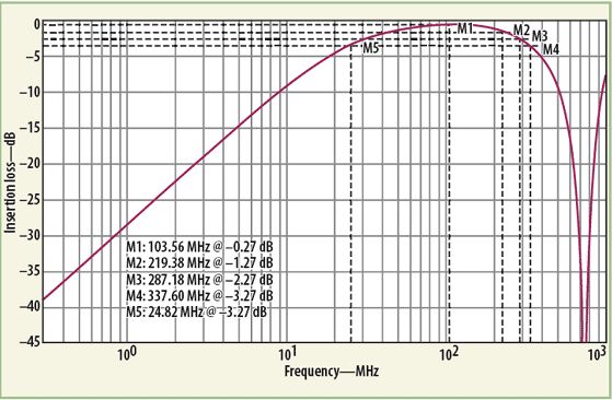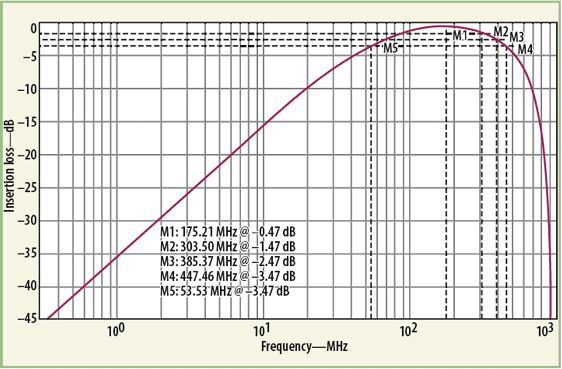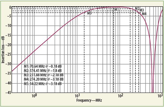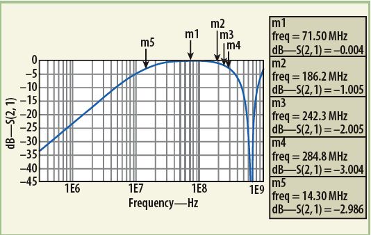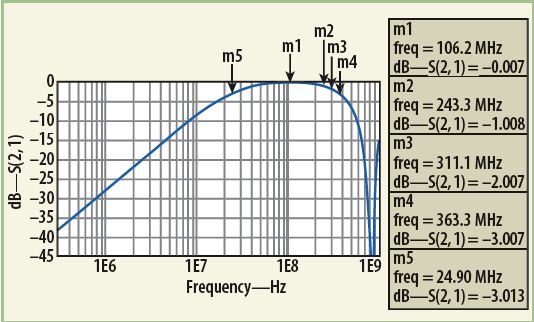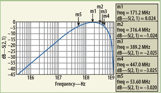 MathWorks的MATLAB数学分析软件曾被用来分析这种变压器器件模型的响应。分析中,把单独的低频(公式1)响应和高频(公式5)响应的插损响应结合在了一起。将所需的目标值代入MATLAB公式,可获得宽带变压器的最终响应。为了执行MATLAB模型数值响应的电气仿真,使用了ADS建模软件。该软件有一个很有用的内部源模型,称为XFERRUTH,其变量参数包括匝数(N)、电感因子(AL)、传输线特性阻抗(Z)、传输线电气长度(E),以及计算传输线长度所需要的参考频率(F)。