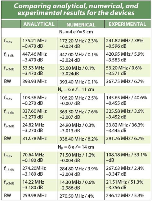 构建的第一个器件线圈匝数为4,因此传输线长度为9cm。图8、9和10分别显示了分析、数值和实验三种情况下的频率插损行为。表中总结了主要的参数值,包括最大幅值、-3dB频率(fmax、fi-3dB和fs-3dB)、适当的带宽(BW),以及相比模型值频率偏差百分比下的各种插损结果。通过分析、数值和实验方法获得的结果间的偏差非常小,信号频率最大时例外。这都是由于测量设置中噪声和其它寄生效应造成的测试系统的局限性。在幅度基本稳定的测试频带上,信号电平的变化是几乎察觉不到的,也许这就是最大信号幅度频率的报告中出现偏差的原因。