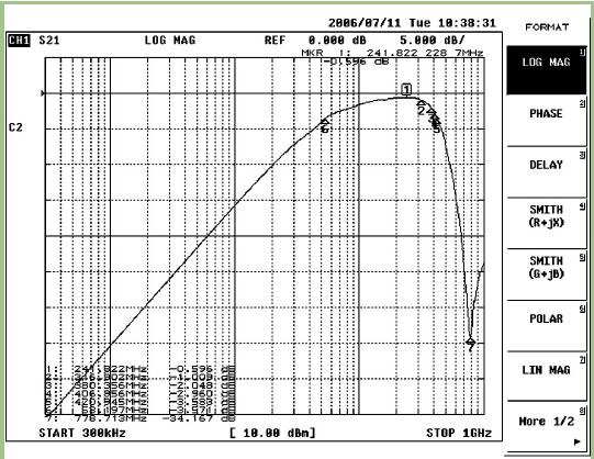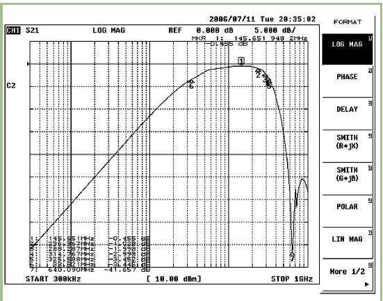 尽管三组结果是由不同的方法求出的,但它们彼此吻合良好。分析(MATLAB)和数值(ADS)模型获得的响应与实验获得的响应(VNA测量值)比较起来十分接近。利用分析和数值方法获得的值近似相等,但与实验结果相比有少许差异。最好的解释是,理论模型没有把变压器结构中所采用的各元件的复杂特性完全考虑在内,而是按照几乎“理想”的元件来建模的。