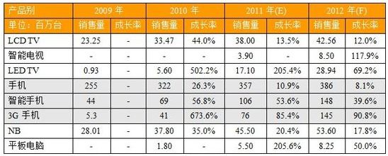 以LCD TV产业为例,近年Samsung、LG等外资厂商积极推出智能电视,海信、长虹、TCL等六大本土电视厂也加速跟进,使得中国大陆智能电视销量将从2011年的390万台快速成长到2012年的850万台,成长率高达117.9%,渗透率也将提升至20%。此外,2012年中国大陆LED TV,预估也将交出销售2,894万台、成长69.2%的佳绩。