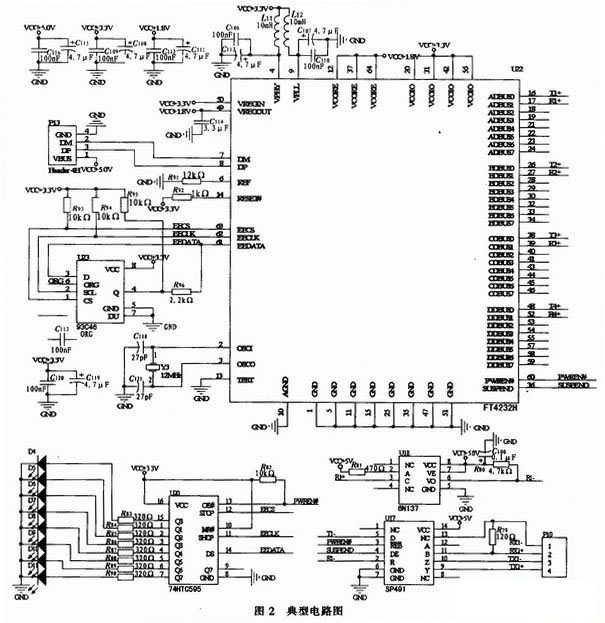 整个系统的供电来源于USB接口的+5 V;因此芯片工作在USB总线供电模式,典型电路如图2所示,采用标准的USB接口P1,FT4232H提供了标准的发送TX和接收RX引脚输出输入线,因此与外设的连接方式非常灵活、方便。跟RS422的连接方式如图中所示,为方便只给出了发送和接收两组差分信号线,通过PWREN#和SUSPEND#的输出来控制信号的发送和接收。图中94C46是一片串行的EEPROM,用于存储产品的VID、PID、设备序列号以及与设备相关的文字说明,芯片的容量大小可以根据用户需要进行选择,本文中选用的是容量为1 K的芯片。虽然转换器在没有EEPROM芯片一样可以正常工作,但这时设备的工作方式是FTDI公司默认的内容,如果用户想写入自己的VID、PID等信息必须外接一片EEPRO-M,其具体内容有一定的格式,本设计的工作方式是FTDI公司默认的。