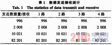 我们在测试中利用串口助手,波特率设为115 200,测试结果如图3所示,实践证明,使用FT4232H芯片设计出来的USB转换器可使在串口RS422和USB口之间非常容易地建立可靠的连接。能够同时接收来自四路RS422接口的数据,而且此四路RS422接口任何一路或者多路停止传送数据,对其他路数的数据传送没有任何的影响。说明四路RS422接口相互之间是独立工作的。同时我们也做了数据的掉包统计,如表1所示。从表1结果表明,在发送数据的过程中,并没有出现掉包的情况,因此达到了设计要求。