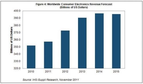 但不都是负面消息。虽然第二和第三季度的消费电子营业收入低于去年同期水平,但随着电视与蓝光播放器假日销售高于2010年水平,上述趋势将从第四季度开始逆转。IHS公司认为,预计2012和2013年增长率将超过4%,相比于当前的低迷状态,届时多数消费电子领域将会恢复活力。