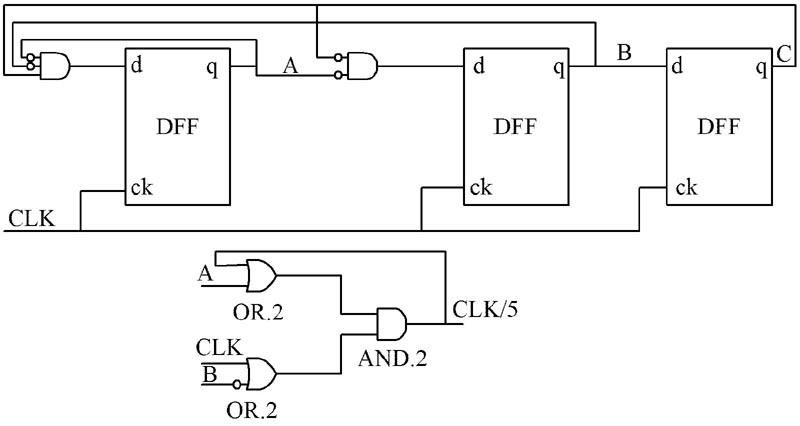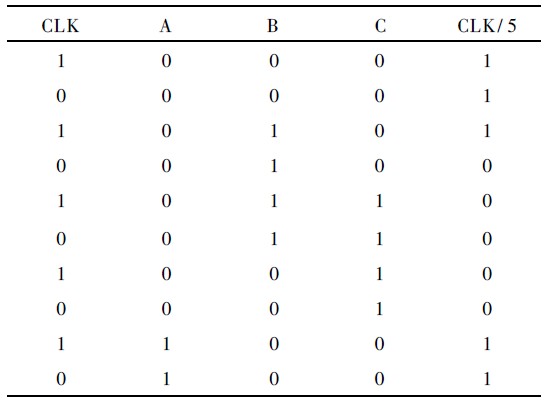 采用基于D 触发器结构的五分频器逻辑框图如图1所示。图1 由3 个D 触发器和少量逻辑门构成, 采用了同步工作模式, 其原理是由吞脉冲计数原理产生2 个占空比不同的五分频信号A 和B, 然后对时钟信号CLK, A 和B 进行逻辑运算得到占空比为50% 的五分频信号CLK/ 5, 其计数过程如表1 所示, 从表1 的计数过程可知, 分频后的时钟CLK/ 5 的周期是输入时钟CLK 的5 倍, 由此实现了五分频并且其占空比为50% .