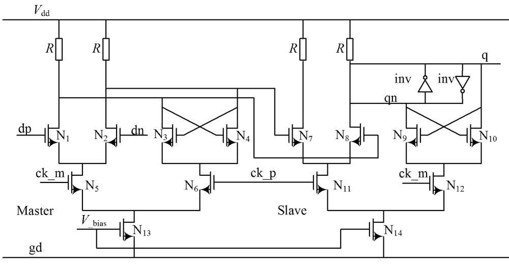 CML 电路构成的触发器如图2 所示, 由图中可以看出, 该触发器由2 个CML 结构锁存器组成, 它们构成主从型结构, 每个锁存器都要经过2 个阶段: 跟踪阶段和保持阶段。当主锁存器跟踪输入信号时, 从锁存器处于锁存保持阶段, 然后交替。其中N13 , N14 为尾电流管, 偏置电压V_bias 使N13 , N14管工作在饱和状态, 充当恒流源的作用。dp 和dn 是由输入信号d 经传输门和反相器产生的一对互补差分信号, ck_m 和ck_p 是由输入时钟信号clk 经传输门和反相器产生的一对互补时钟差分信号。主锁存器工作状态为: 当ck_m 为高电平时, N5 管导通, N6 管关闭, 此时N1 , N2 管工作在差分状态, 将输入信号dp, dn 采入。当ck_p 为高电平时,N6 管导通, N5 管关闭, 此时N3 , N4 使电路维持在锁存状态, 从锁存器工作状态恰好与主锁存器工作状态相反。设计中在触发器输出端q, qn 之间加了2 个反相器从而在q, qn 之间形成正反馈, 增强了电路的输出驱动能力。工作时, 电路的尾电流应当足够大, 有利于提高电路工作频率和输出信号的摆幅。