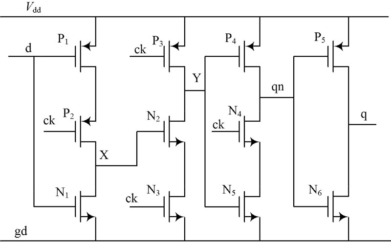 TSPC 电路构成的触发器如图3 所示, 由图中可以看出, 该电路由四级反相器构成, 上升沿触发, 当CK 为低电平, 输入反相器在节点X 上采样反向d 输入,第2 级反相器处于保持状态, 节点Y 预充电至V dd,第三级反相器处于保持状态, 时钟上升沿来时, 第二级反相器求值, Y 的电平值发生变化, 时钟ck 为高电平时,节点Y 的值传送到输出q, 该触发器的延时为4 个反相器的传播延时, 由于电路中元件数目很少, 而且采用动态逻辑, 因此功耗极低。